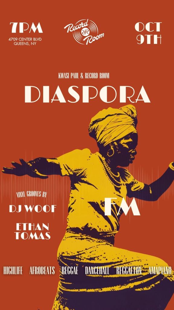 Kwasi Paul and Record Room continue their epic collaboration with “Diaspora FM” next Wednesday, October 9th. Let DJ Woof and Ethan Tomas guide you through a night of Reggae, Afrobeats, Dancehall, Amapiano, Highlife, and more paired with specialty drinks. This is just the beginning—be part of the movement.